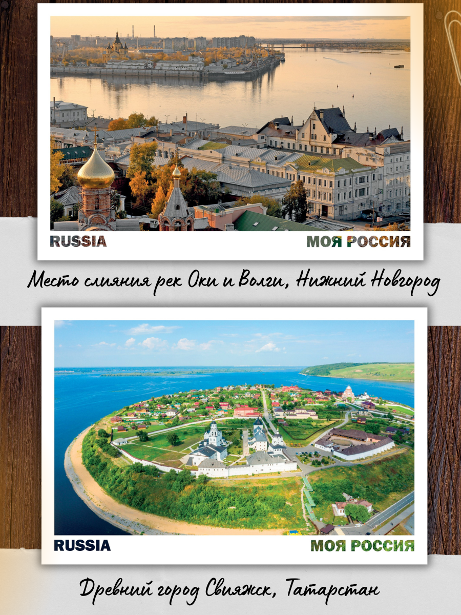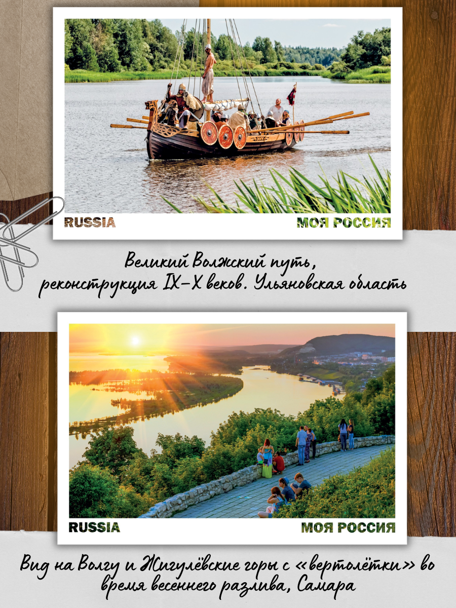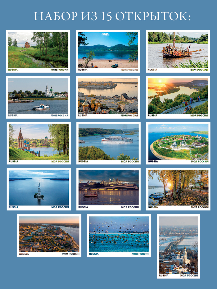У каждого — свой образ Волги в сердце. Мы и не тешили себя надеждой, что сможем поместить в набор из 15 открыток все её красоты, но мы постарались отразить то, как меняется облик Волги от истока к дельте, как величава она от Твери до Астрахани. Вот что у нас получилось: